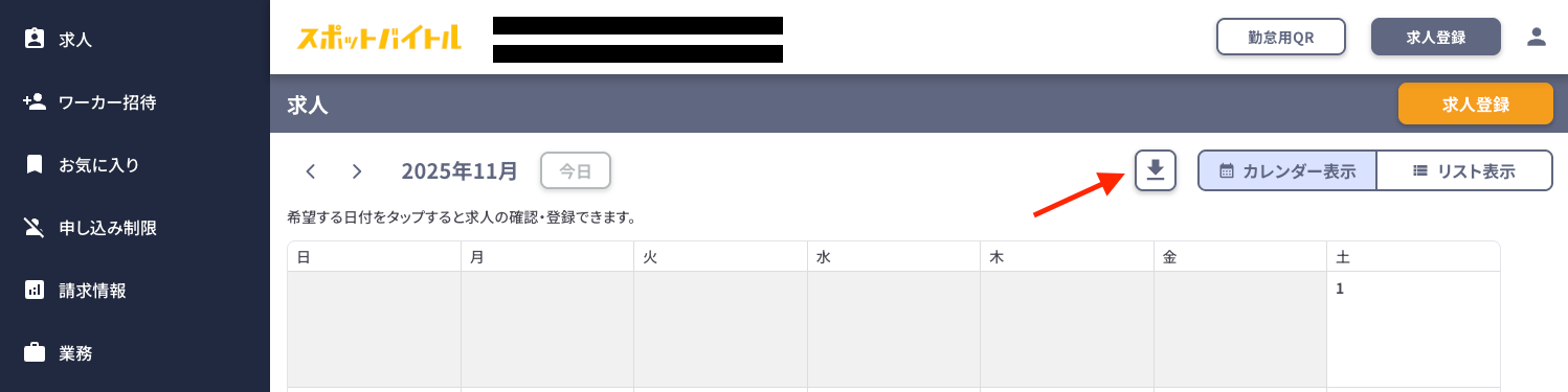 求人ページ内に表示されている「カレンダー表示」と「リスト表示」の左側に、ダウンロードボタンがあります。このボタンをクリックしてください。 - 就業日と店舗を選択する