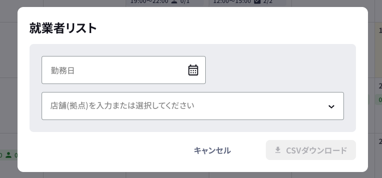 ダウンロードボタンを押した後、表示される画面で以下の2つの情報を選択します:- 就業日:リスト化したい求人の就業日を選択します。